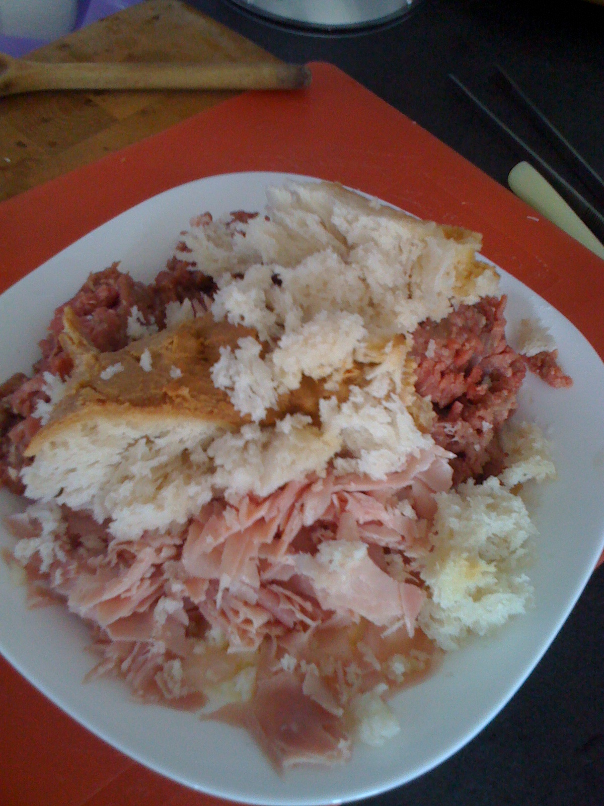 Quindi mescoliamo la mozzarella, la carne tritata, il prosciutto sminuzzato, il pane strizzato, le uova, il parmigiano, ed infine sale e pepe.